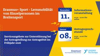 Zur Vorbereitung auf die Antragsfristen bietet JUGEND für Europa regelmäßig digitale Serviceveranstaltungen zu Erasmus+ Sport an. Auf den Veranstaltungen lernen Sie die Fördermöglichkeiten kennen und erfahren, wie Sie erfolgreiche Anträge stellen können. Wir freuen uns über Ihre Anmeldung.